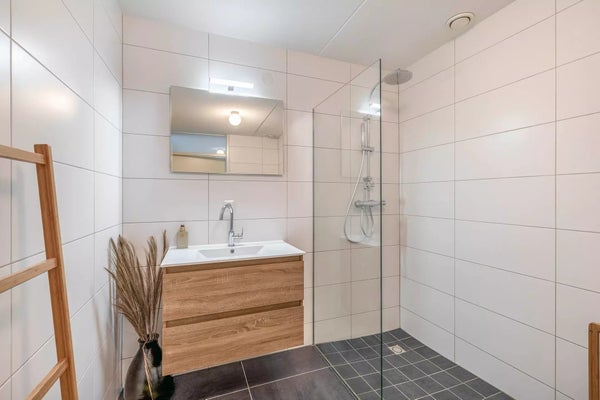 De badkamer heeft een inloopdouche, wastafel met meubel en spiegel, handdoeken radiator en toilet.