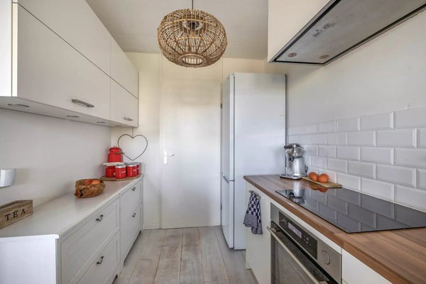 De keuken is voorzien van diverse inbouwapparatuur waaronder een vaatwasser, oven en inductie kookplaat en de opstelling voor de wasmachine en droger.