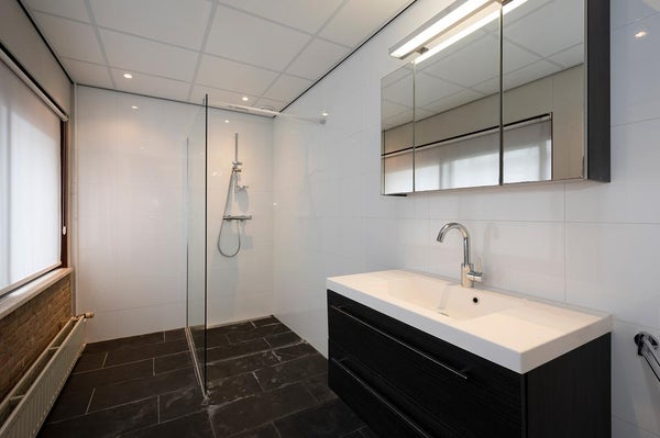 De ruime badkamer is voorzien van inloopdouche en luxe wastafelmeubel.