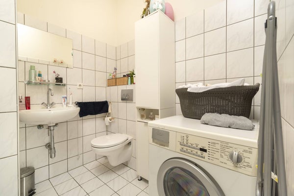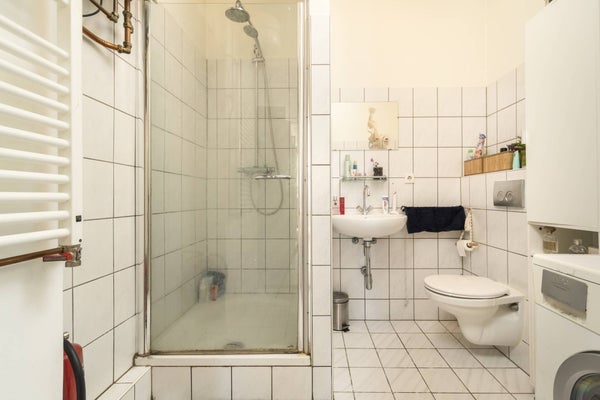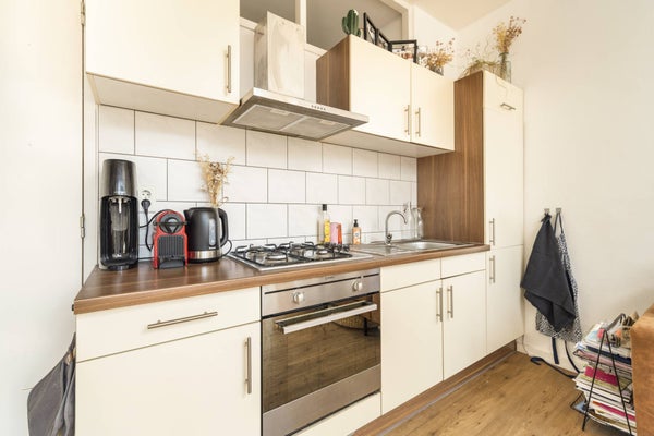 De keuken bevindt zich aan de achterzijde van de woonkamer en is ruim opgezet. Deze is voorzien van onder andere een oven, koelkast, vriezer en voldoende kastruimte. Aangrenzend aan de slaapkamer ligt de badkamer, uitgerust met een toilet, douche, wastafel en een aansluiting voor de wasmachine.