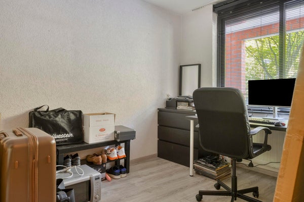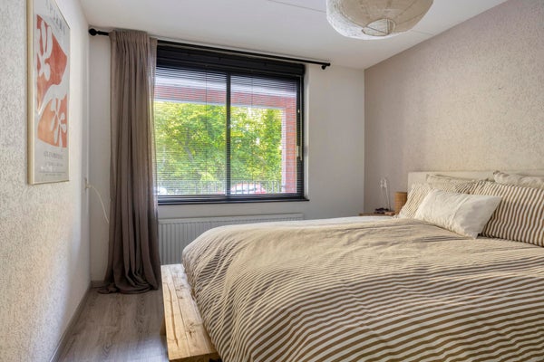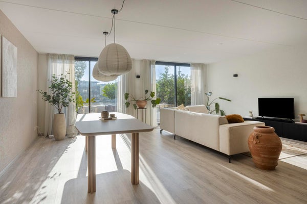 Bij binnenkomst treft u een ruime hal die toegang biedt tot twee slaapkamers aan de voorzijde, een badkamer voorzien van ligbad, douche en wastafel en een apart toilet met fonteintje. Daarnaast is er een praktische berging met aansluiting voor wasmachine en droger. De riante woonkamer met open keuken ligt aan de achterzijde van het appartement en beschikt over een dubbele schuifpui die direct toegang geeft tot het zonnige terras aan de achterzijde. Bovendien beschikt het appartement over een eigen berging om uw fietsen in te stallen.