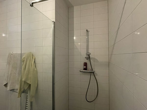 De badkamer is voorzien van een wastafel met spiegel, een handige douchewand en een handdoekradiator. Verder zit er een apart, zwevend toilet nabij de hal.