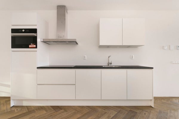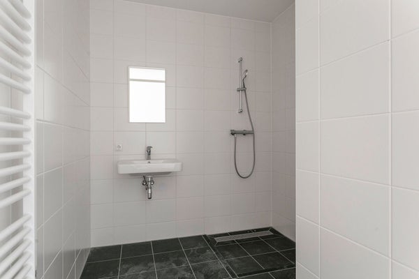 Entree appartement. Zeer ruime en lichte L-vormige woonkamer met open keuken. De keuken is voorzien van koel-vries combinatie, vaatwasser, oven, inductiekookplaat en afzuigkap. Via de woonkamer is het balkon gelegen op het noordwesten te betreden. Ook geeft de woonkamer toegang tot de afgesloten hal. Aparte ruimte met warmtepompinstallatie en de aansluitingen voor wasmachine en droger. Separaat toilet met fonteintje. Badkamer met inloopdouche, wastafel en handdoekradiator. Ruime slaapkamer gelegen aan de voorkant van de woning.