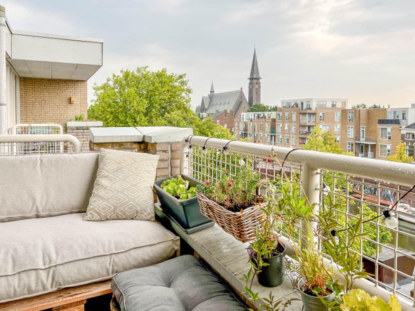 De ruime woonkamer met grote ramen biedt prachtig uitzicht op de Oude Herengracht. Het balkon is toegankelijk vanuit de woonkamer.