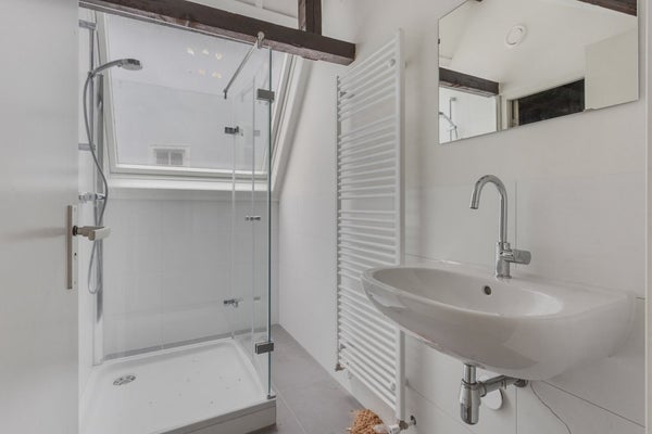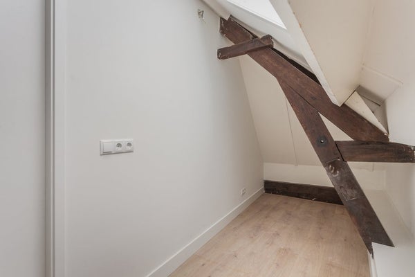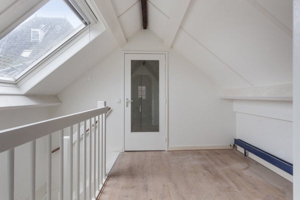 Overloop met toegang tot een ruime slaapkamer onder de sfeervolle schuine kap met originele houten balken. Tweede kamer geschikt als slaapkamer, werkruimte of inloopkast. De moderne badkamer is voorzien van een douche en wastafel. Ook vind je hier een handige berging.
