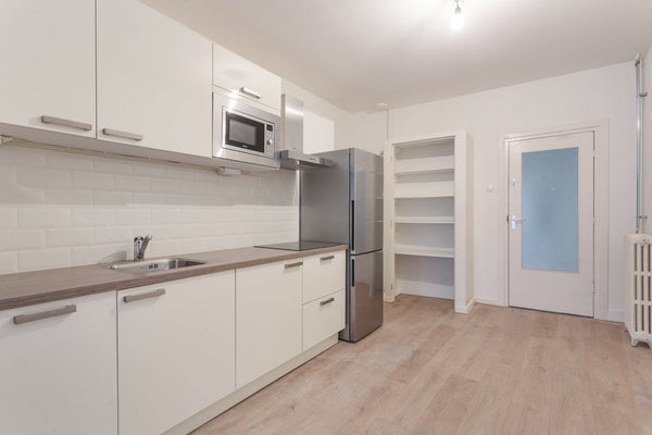 Via de entree tref je een hal met modern toilet. De moderne open keuken is uitgerust met inbouwapparatuur zoals een inductiekookplaat, afzuigkap, vaatwasser en magnetron. Daarnaast zijn er een losse koel-vriescombinatie en wasmachine aanwezig. De ruime, lichte woonkamer heeft grote raampartijen en biedt via een trap toegang tot de privé achtertuin op de begane grond.
