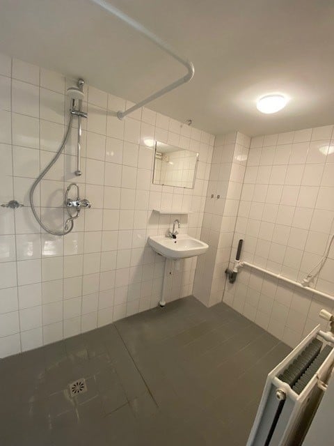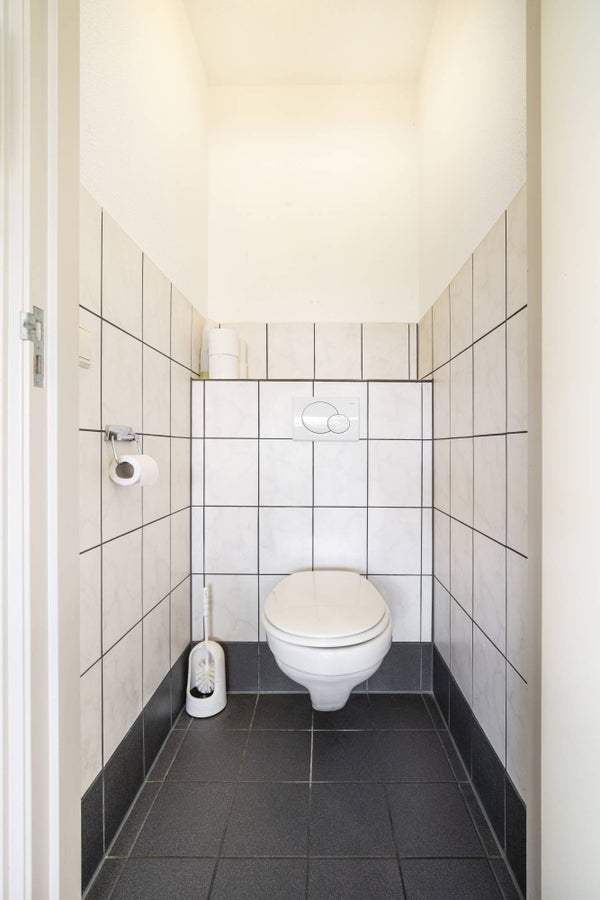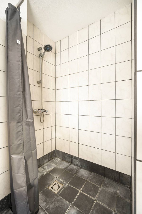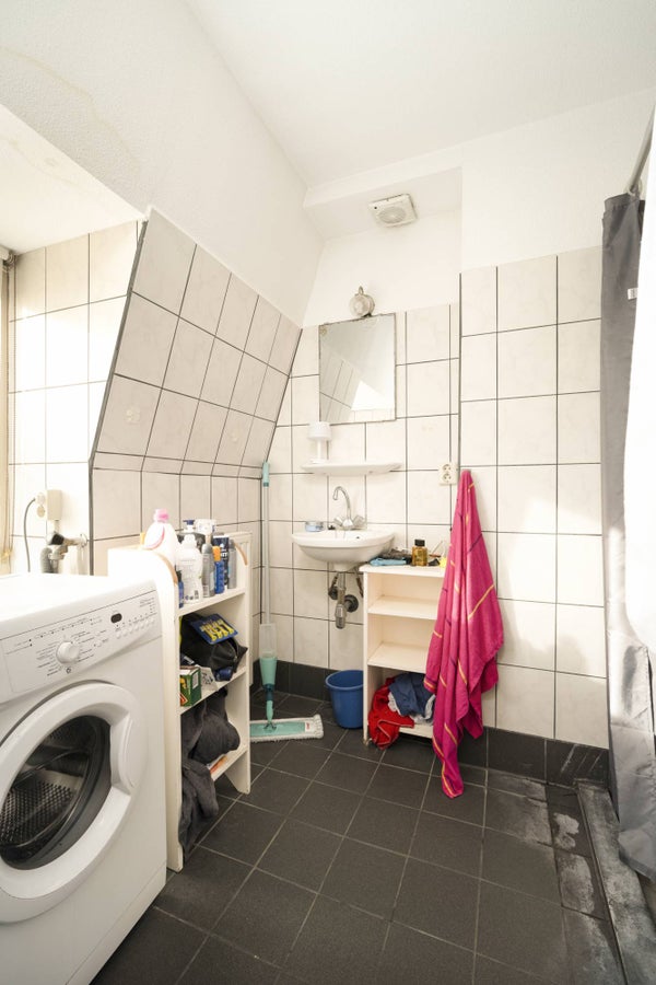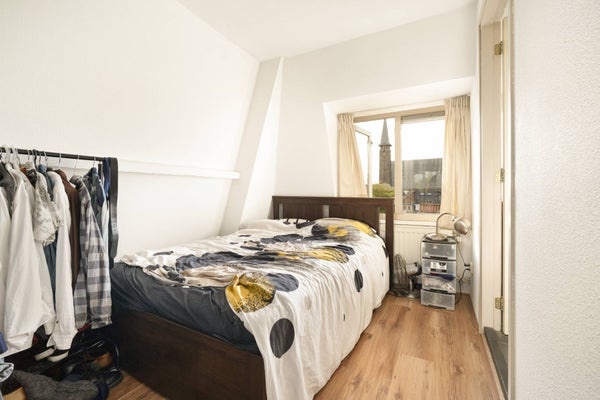 De slaapkamer bevindt zich aan de andere zijde van de woning. Ook deze ruimte is voorzien van een raampartij die te openen is. De badkamer is te bereiken via de slaapkamer. De badkamer is voorzien van een inloopdouche en een wastafel. Er is een aansluiting voor een wasmachine aanwezig. Het appartement beschikt tot slot over een separaat toilet.