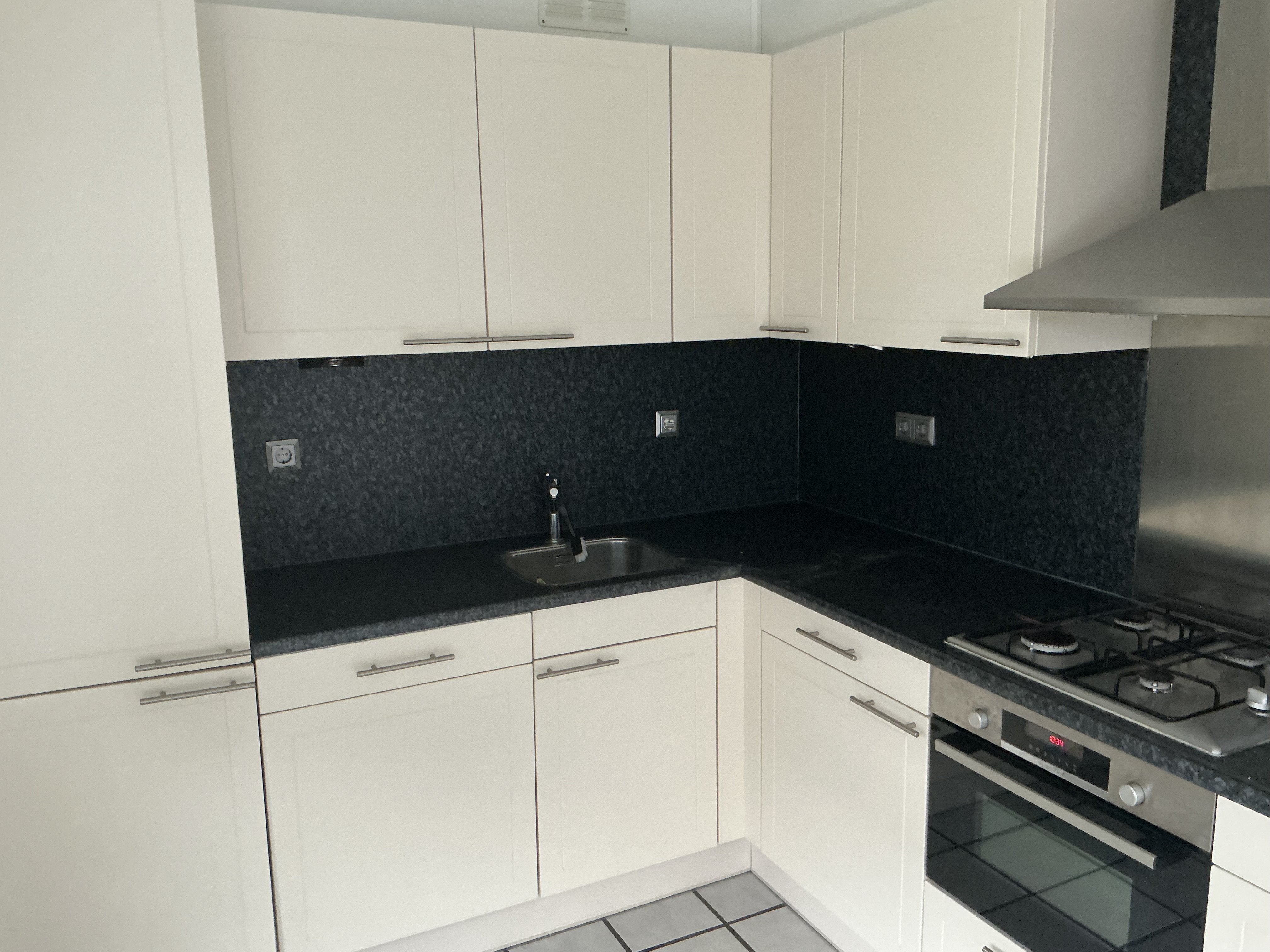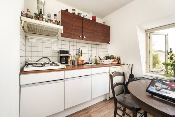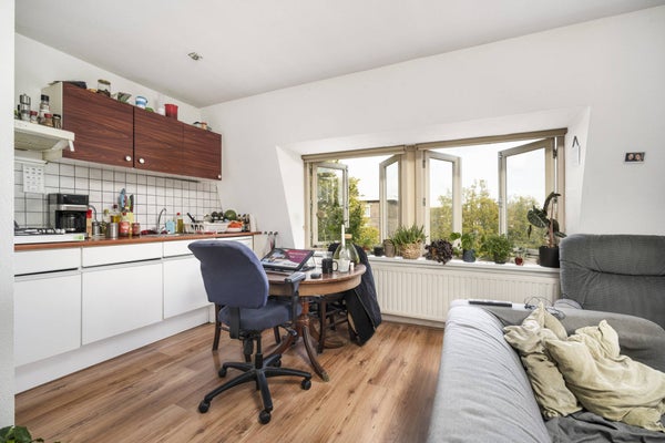 Bij binnenkomst in de woning vind je aan je linkerhand direct de woonkamer. De diverse raampartijen in deze ruimte voorzien de woning van een aangename hoeveelheid licht. Aan de linkerzijde van de woonkamer bevindt zich de keuken. Zoals op de foto's te zien is, is de keuken voorzien van ruim voldoende kastruimte. De kookplaat en de afzuiger zijn bij de woning inbegrepen.