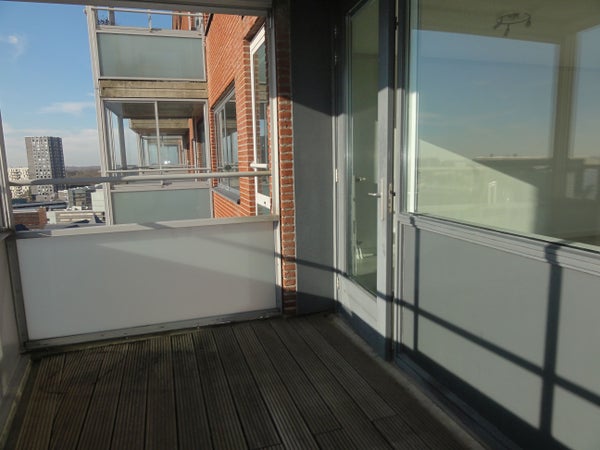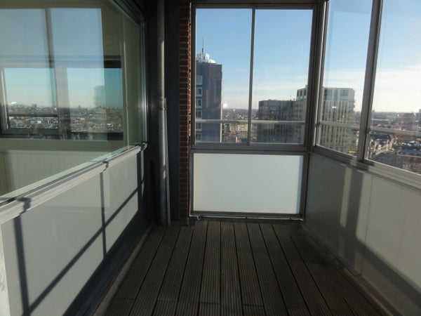 13e etage: ruime lichte woonkamer met weids uitzicht en toegang tot het balkon/loggia (Z/W), half open keuken met veel kastruimte en inbouwapparatuur. Drie ruime slaapkamers, toilet, badkamer met douche, tweede toilet en dubbele wastafel. In de inpandige berging bevinden zich de wasmachine en droger.