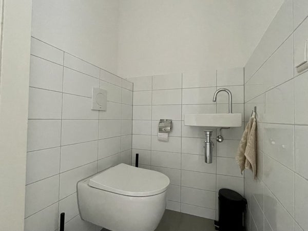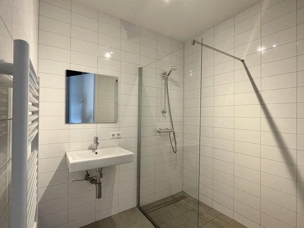 De badkamer is voorzien van een wastafel met spiegel, een handige douchewand en een handdoekradiator. Verder zit er een apart, zwevend toilet nabij de hal.