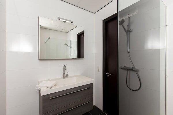 De twee ruime slaapkamers zijn beide voorzien van een comfortabel tweepersoonsbed en een garderobekast. De badkamer is uitgerust met een inloopdouche en luxe wastafelmeubel. Het toilet beschikt over een hangend closet en fonteintje, met dezelfde hoogwaardige materialen als de badkamer. Daarnaast is er een technische ruimte met stofzuiger, strijkplank en strijkbout, evenals de opstelling van de wasmachine en droger.