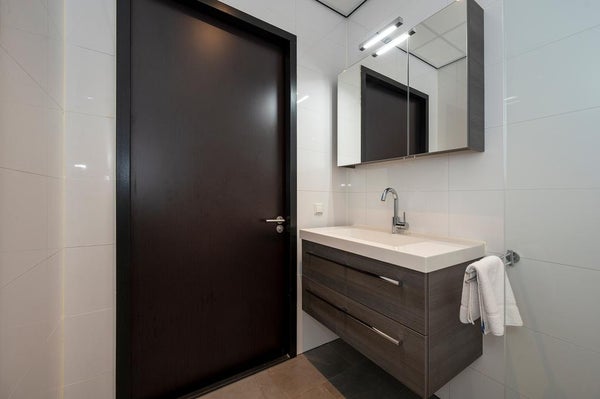 De badkamer is geheel in stijl afgewerkt en straalt één en al luxe uit, dit komt mede door de toegepaste materiaalkeuze.