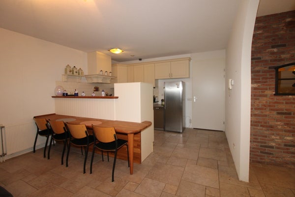 De woonkamer gaat over in de open keuken voorzien van alle apparatuur met grote eettafel/bar en een aparte eetkamer.