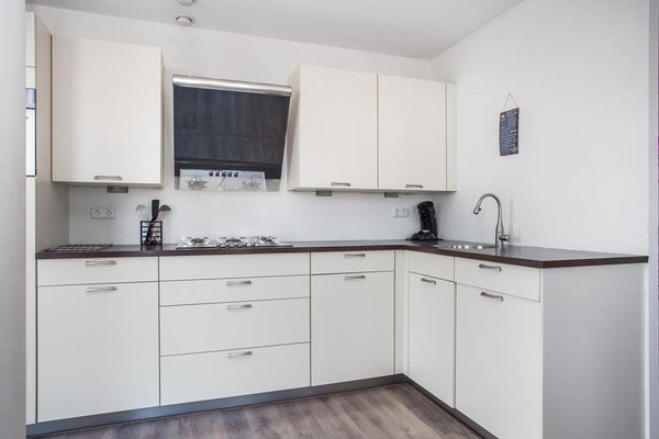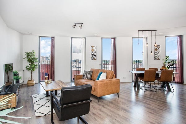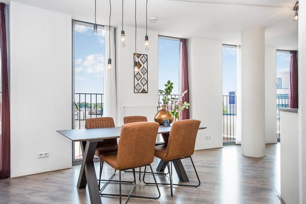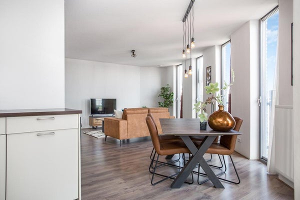De royale en bijzonder lichte woonkamer beschikt over meerdere openslaande deuren met Franse balkons en biedt een vrij uitzicht over het centrum van Lelystad. De moderne open keuken in hoekopstelling is uitgevoerd met diverse inbouwapparatuur, waaronder een RVS design afzuigkap, 5-pits gaskookplaat, vaatwasser, koelkast en een aparte vriezer.