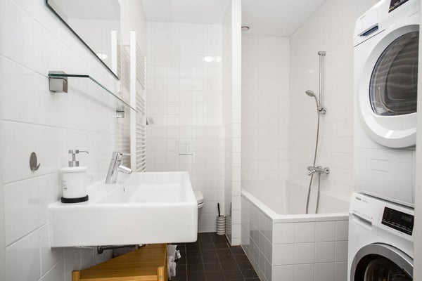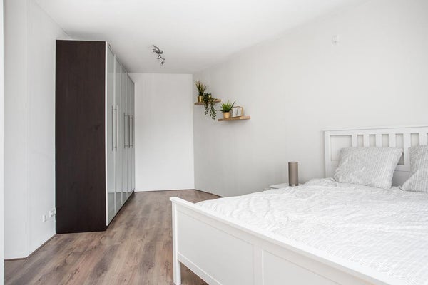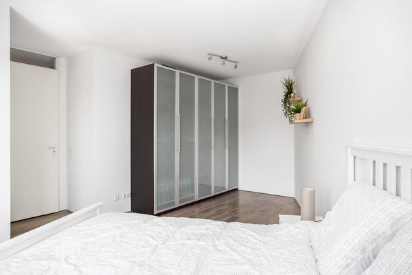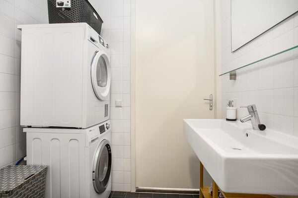 Aan de rustige achterzijde van het appartement bevinden zich twee ruime slaapkamers met veel lichtinval. De volledig betegelde badkamer is voorzien van een ligbad met douche, wastafel, tweede vrijhangend toilet en een opstelplaats voor wasmachine en droger.