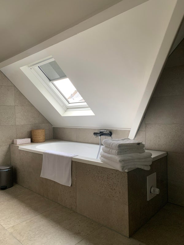 Je auto fijn voor de deur geparkeerd, of stal je fiets lekker in het halletje. Na binnenkomst ga je de trap op en kom je uit op een prachtige en zeer ruime overloop met een plafondhoogte van 350cm. Deze ruimte is ideaal als werkruimte door de mooie lichtinval, geluids-isolatie en niet te vergeten de hoogwaardige afwerking en inrichting met Vitra meubilair. Aangrenzend heb je een zeer ruim toilet met wasruimte. Aan de andere zijde van de overloop loop je zo je ruime slaapkamer binnen met aangrenzende badkamer; voorzien van een heerlijk ligbad en daarnaast een zeer luxe en ruime regendouche. De slaapkamer zelf is voorzien van een elektrisch aupingbed, veel kastruimte, verduisterende gordijnen en iconisch MarcelWanders behang.