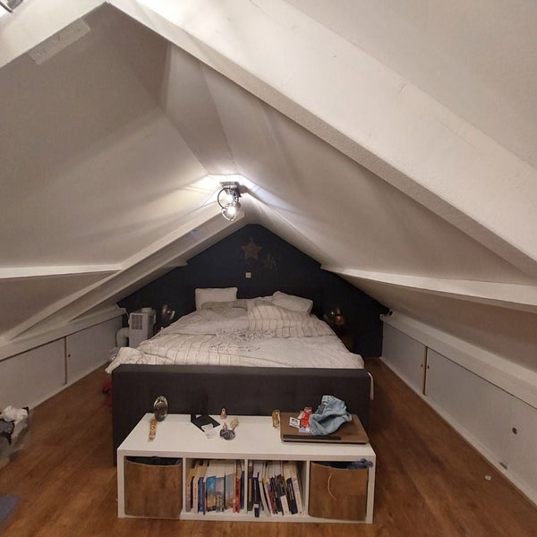 Via vaste trap te bereiken: slaapkamer met vaste kastruimte onder het schuine dakvlak.
