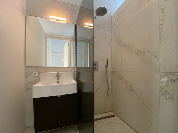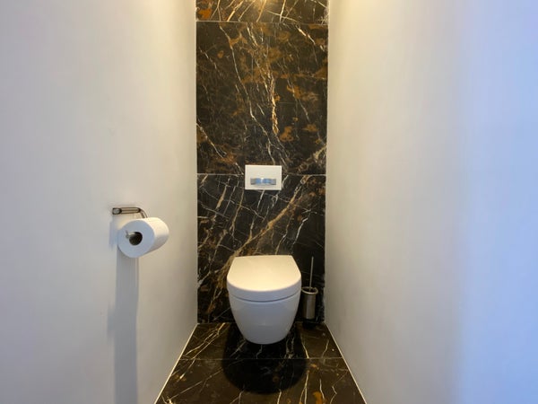 Badkamer geheel vervaardigd uit exclusief wit marmer met een wastafel, vloerverwarming en “regen-douche”, apart toilet gemaakt van zwart marmer met vloerverwarming.