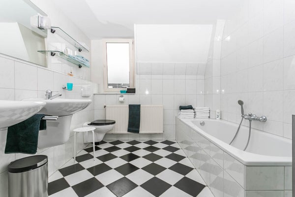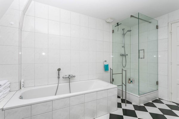 Op de tweede verdieping bevinden zich twee comfortabele slaapkamers (ca. 14 m² en 12 m²) en een luxe badkamer voorzien van een inloopdouche, ligbad en dubbele wastafel met royale spiegel.