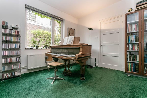 Via de overloop bereikt u een stijlvolle piano-/studeerkamer, met toegang tot een ruime bergruimte. Aansluitend is de wasruimte, voorzien van een wasmachine en droger (inclusief tweede koelkast en ruime vriezer), en directe doorgang naar het royale, volledig ingerichte dakterras – de perfecte plek om te ontspannen of te dineren in de buitenlucht.