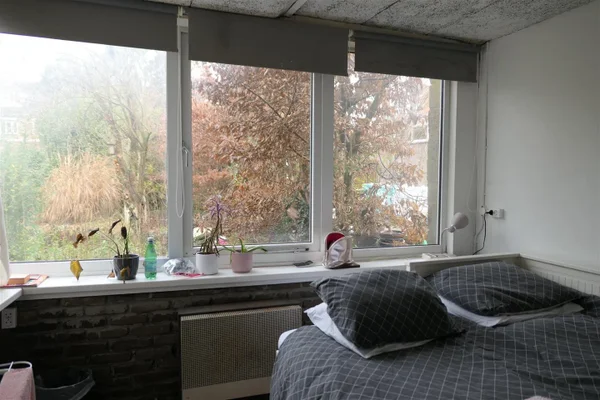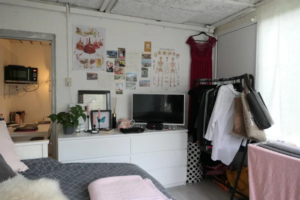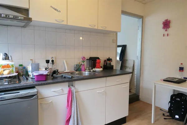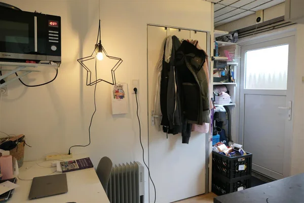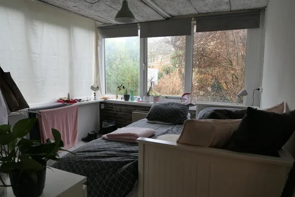 Kamer 7 gelegen in een studentenhuis. De luxe kamer bestaat uit een woon/slaapkamer, keuken en een eigen badkamer met douche en toilet. Met 6 andere studenten wordt een grote tuin en wasruimte gedeeld.