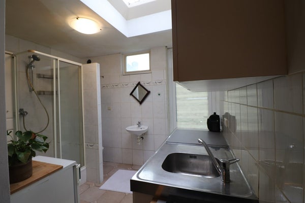 De keuken is uitgerust met een tweepits elektrische kookplaat, koelkast, oven, afzuigkap en voldoende opbergruimte. Bestek, kookgerei en servies zijn aanwezig. De wasmachine staat in de gedeelde entree/hal.