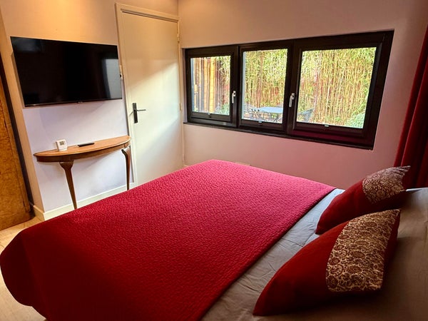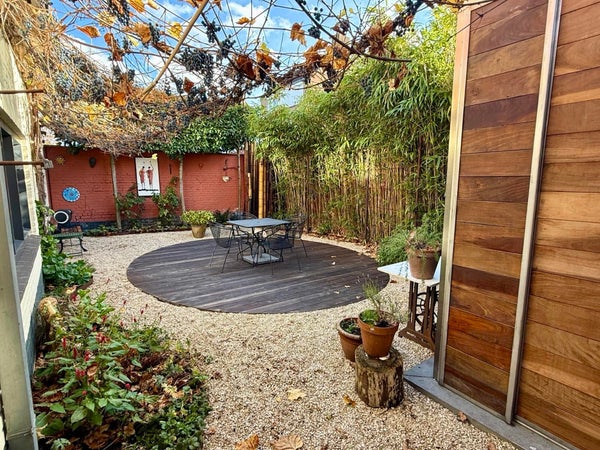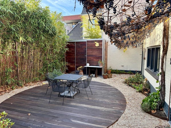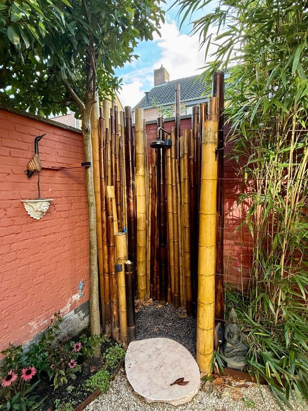 De tuin ligt op het zuidoosten, heeft een oppervlakte van 53m² en is uitgerust met een terras en een elektrische aansluiting. Heel bijzonder is hier, de Balinese buitendouche voorzien van warm en koud water. Er is een eigen, privé ingang, wat zorgt voor extra gemak en privacy.
