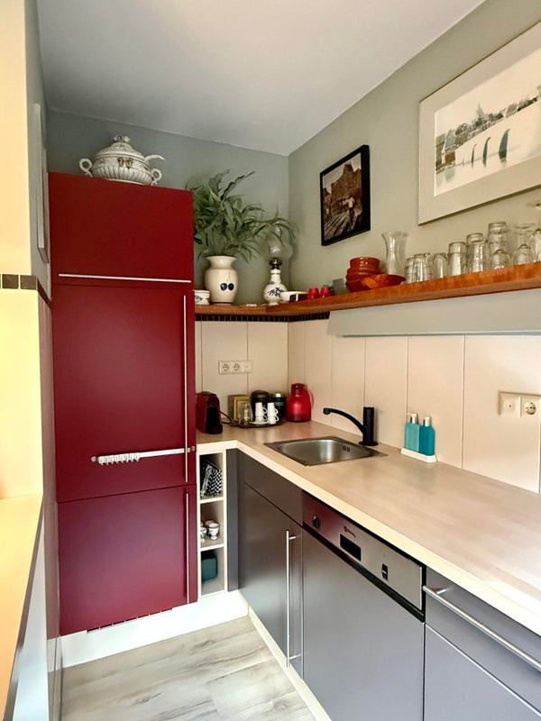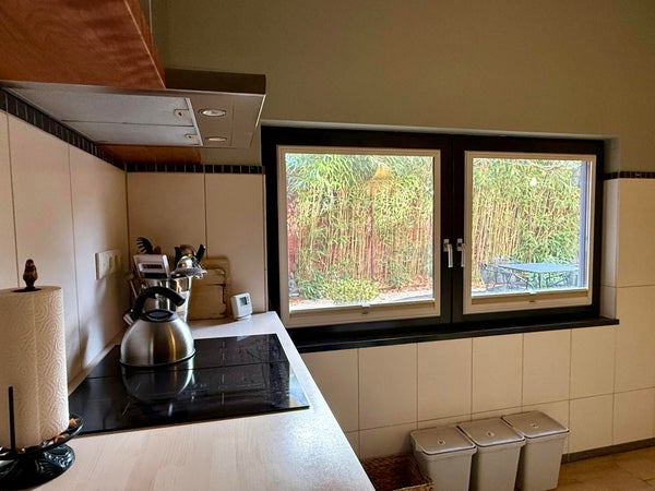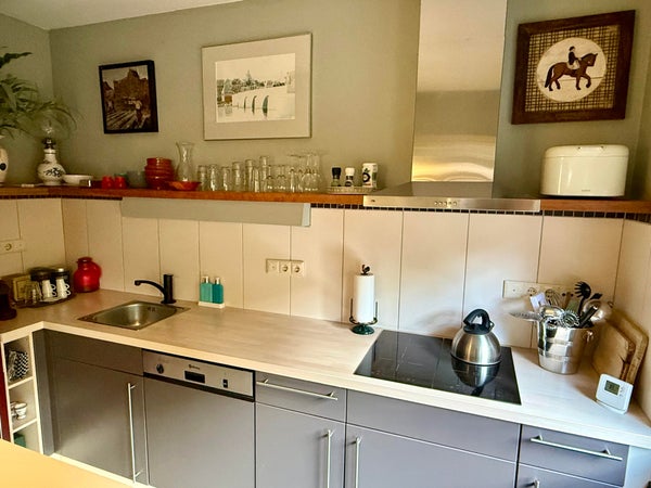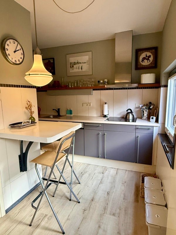 De keuken beschikt over moderne apparatuur, waaronder een inductiekookplaat, ingebouwde apparatuur een vaatwasser, een afzuigkap en een koelkast met vriesvak. Met een oppervlakte van 10m² is het een fijne ruimte om te koken en samen te komen.