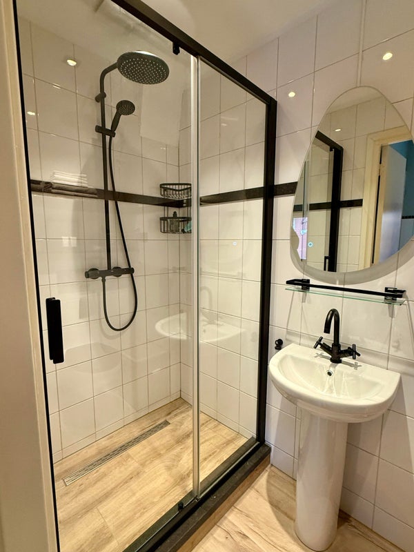 De badkamer van 6m² is praktisch ingericht en voorzien van een inloopdouche, wastafel en toilet. Daarnaast is er een stopcontact aanwezig voor extra gemak.
