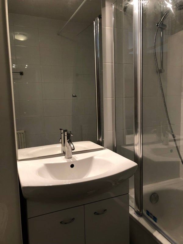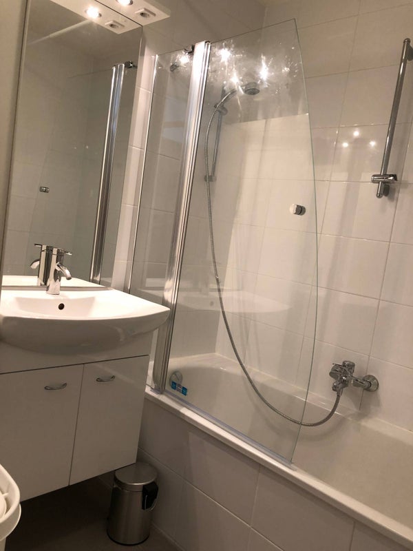 - Badkamer met douche-bad en wastafel