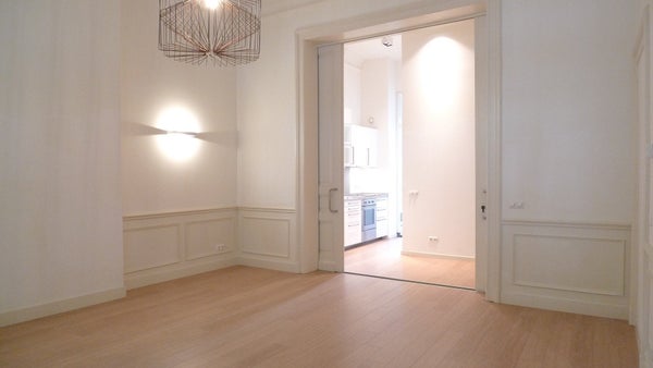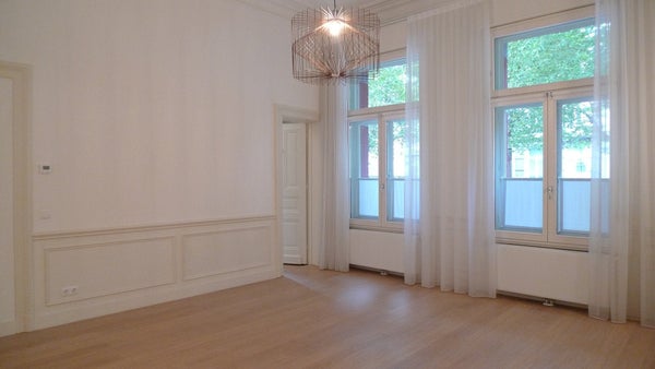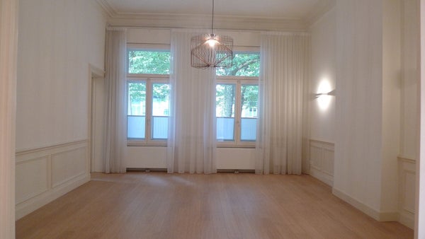 Indeling BG: gezamenlijke entree met lift en toegang tot kelderberging ca.9 m² met aansluiting wasmachine en droger. Entree ca.4 m² met aansluitend keuken ca.7 m² voorzien van spoelbak, 4 pits Inductie kookplaat, afzuigkap, vaatwasser, magnetron, oven, koelkast en vriezer. Woonkamer ca.27,5 m² met hoge plafond, lambrisering, rozetten en ornamenten, schuifdeuren en mooie laminaatvloer. Slaapkamer I ca.12,5 m² met toegang tot patio ca.14,5 m². Badkamer ca.5 m² met dubbele wastafel, inloopdouche en toilet. Berging ca.2,5 m².