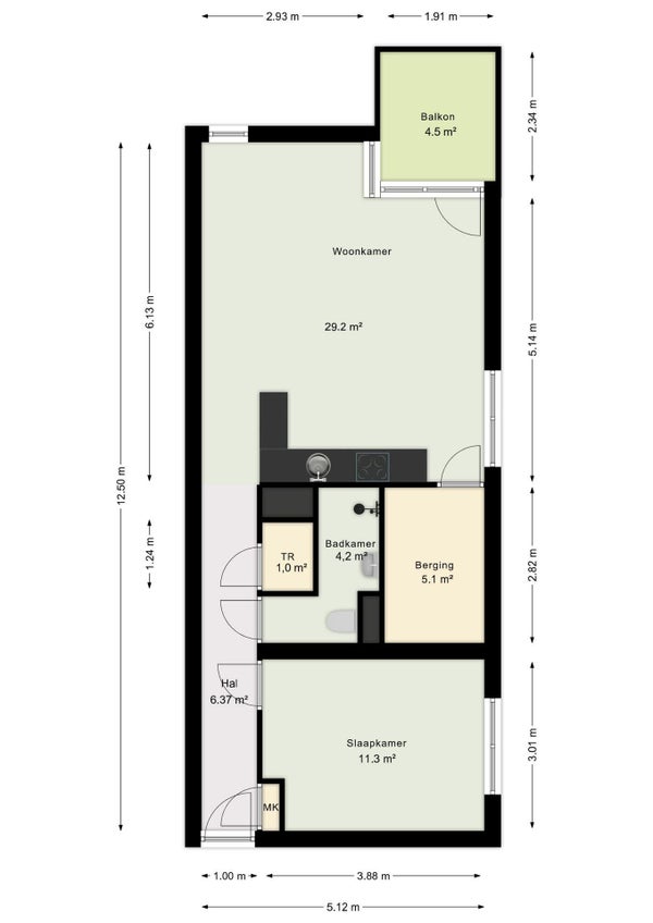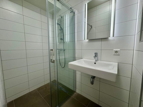 Het appartement beschikt over een ruime slaapkamer, een moderne badkamer met inloopdouche, toilet en wastafel, een prachtig lichte woonkamer met open keuken en een praktische berging.
