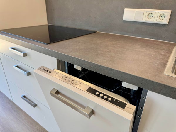 De keuken is compleet uitgerust met een inductiekookplaat, afzuigkap, vaatwasser, koelkast, combi-oven en voldoende opbergruimte.