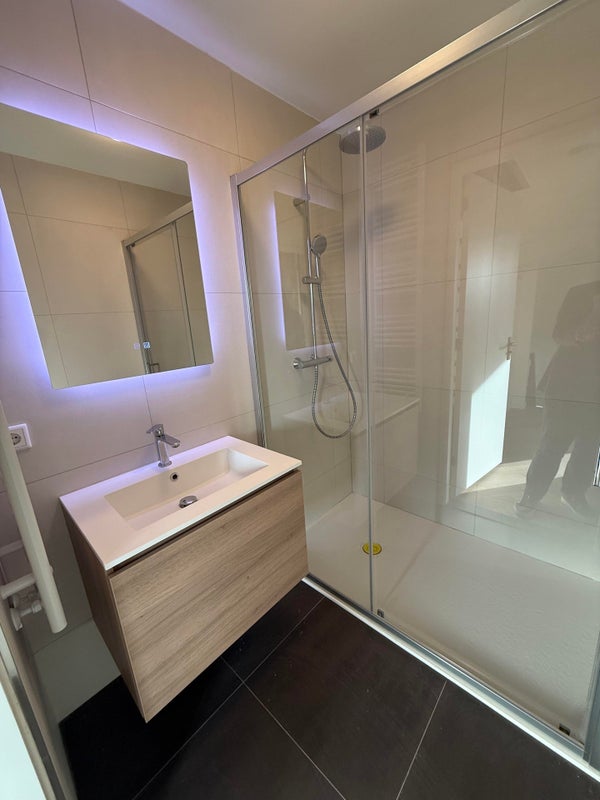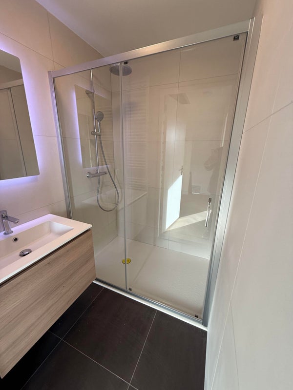 De badkamer (voorzien van inloopdouche, badkamermeubel met verwarmde spiegel).