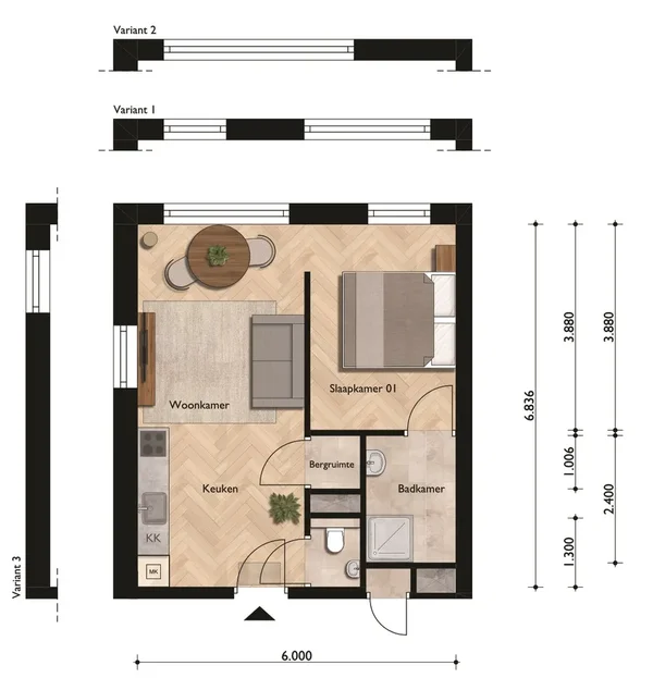Het gestoffeerde appartement bestaat uit een lichte woonkamer met open keuken met inductie kookplaat, koelkast met vriesvak, afzuigkap en comi-oven, separaat toilet, badkamer met douche en wastafel en vitrage. Dankzij de goede isolatie en vloerverwarming is het binnen altijd comfortabel.
