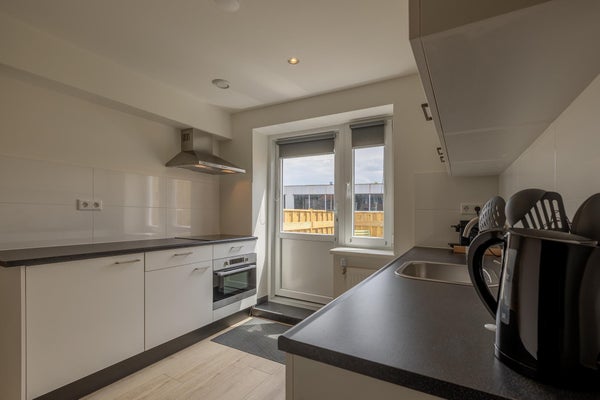 Moderne open keuken, volledig afgewerkt en voorzien van alle basisvoorzieningen.