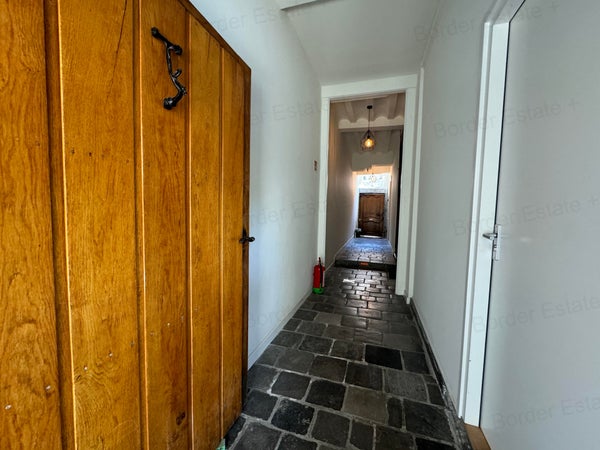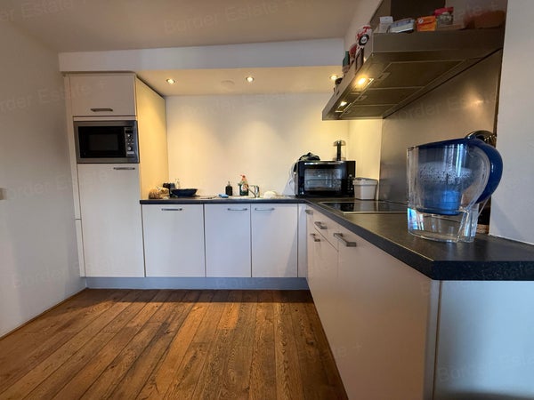 De ruime en lichte woonkamer beschikt over karakteristieke houten balken, een warme houten vloer en grote raampartijen met shutters. De open indeling verbindt de woonruimte op natuurlijke wijze met de moderne keuken, die is uitgerust met diverse inbouwapparatuur en voldoende kastruimte.