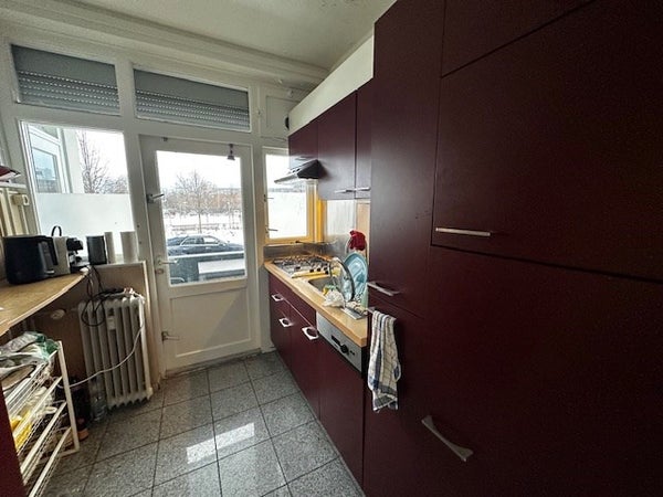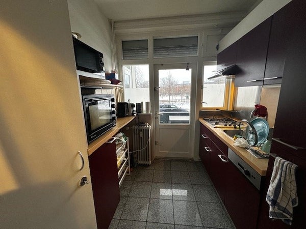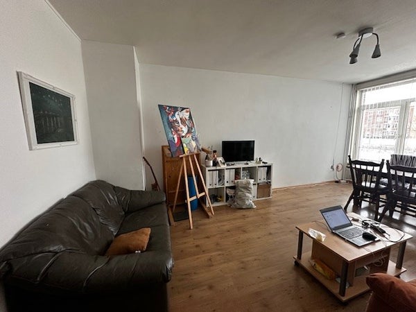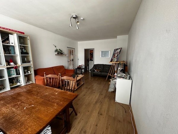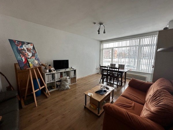 Entree-hal geeft toegang tot de verschillende kamers. Separaat betegeld toilet met fonteintje. Badkamer met douche en wastafel. Gesloten keuken voorzien van aanbouwkeuken met o.a. 4-pits kookplaat en afzuigkap. Vanuit de keuken is er toegang tot het balkon aan de voorzijde met bergruimte. Gezamenlijke ruime woonkamer