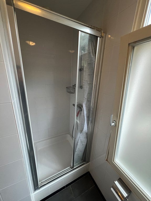 Badkamer (ca. 4 m²) ingericht met douchecabine, wastafelmeubel en hangend toilet.