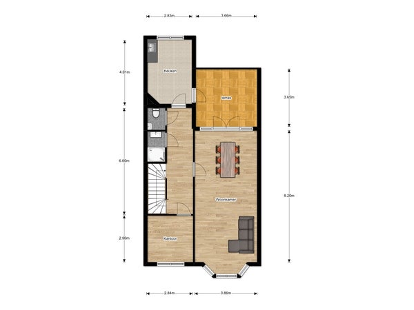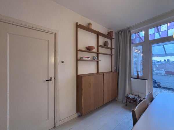 De ruime hal vormt het centrale punt van de verdieping en biedt toegang tot de diverse vertrekken. Vanuit hier bereikt u de studeerkamer, de royale woonkamer met veel natuurlijke lichtinval, het separate toilet, de badkamer en de keuken. Het dakterras is zowel via openslaande deuren vanuit de woonkamer als via een aparte deur vanuit de keuken toegankelijk, waardoor binnen en buiten op prettige wijze met elkaar in verbinding staan.