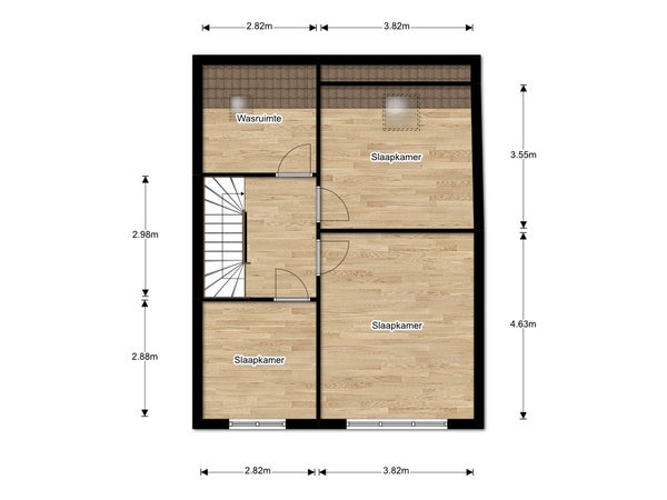 Via de vaste trap bereikt u de tweede etage, waar u uitkomt op een ruime overloop die toegang biedt tot de verschillende vertrekken. Op deze verdieping bevinden zich drie slaapkamers van respectievelijk ca. 8 m², 16 m² en 16 m², alsmede een separate berging. De berging (ca. 5 m²), gelegen aan de achterzijde, is voorzien van aansluitingen voor wasmachine en droger en biedt daarnaast praktische extra bergruimte. De royale slaapkamer aan de voorzijde (ca. 16 m²) beschikt over ingebouwde kasten, wat zorgt voor optimaal gebruik van de ruimte en extra opbergmogelijkheden.