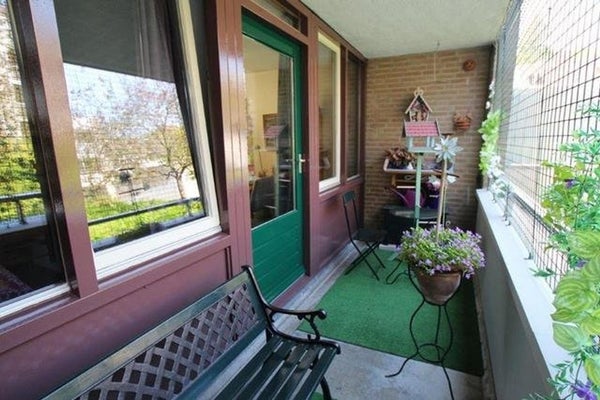 Vanaf het balkon kijkt men uit op het groen van het binnenterrein.