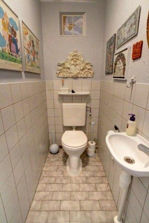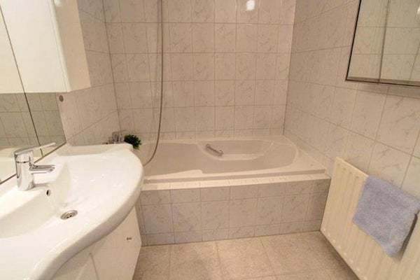 Betegelde badkamer (3,5 m²) met een ligbad en wastafelmeubel, separate toiletruimte met duoblok en fonteintje.