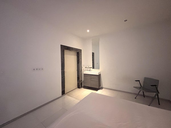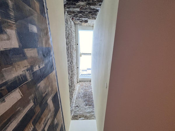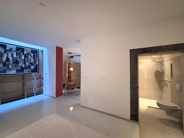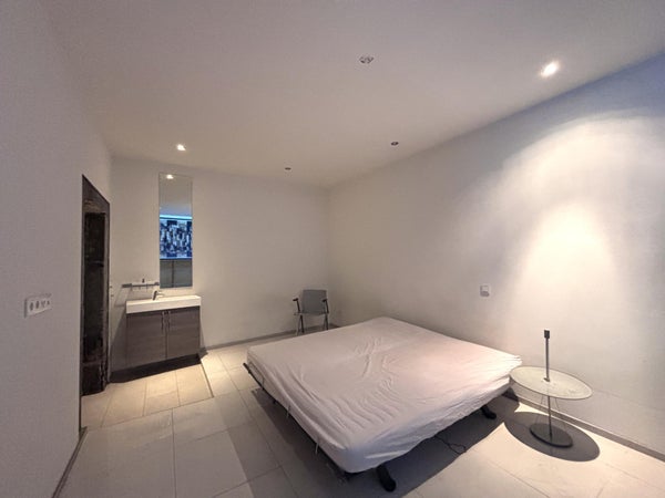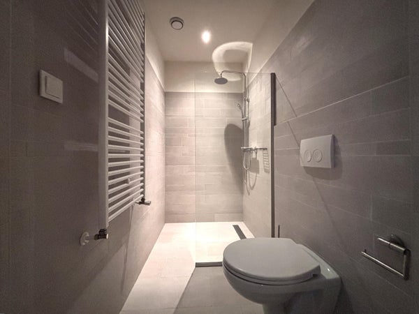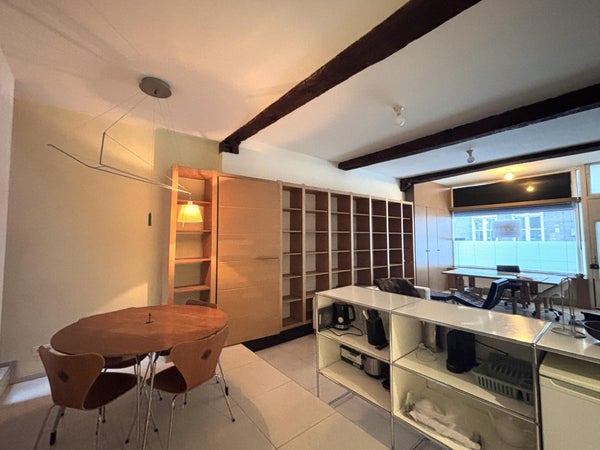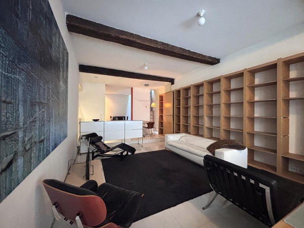 De ruime woonkamer is praktisch en sfeervol ingericht met een eettafel met stoelen, een comfortabele bank en een televisie. Daarnaast beschikt de woonkamer over ruime kastruimte, wat zorgt voor voldoende opbergmogelijkheden. Het karakteristieke karakter van de ruimte wordt versterkt door het authentieke plafond met oude houten balken, wat een warme en historische uitstraling geeft. De keuken is compleet uitgevoerd en voorzien van moderne inbouwapparatuur, waaronder een 4-pits inductiekookplaat, afzuigkap, koelkast, combi-oven en vaatwasser. De keuken biedt voldoende werk- en opbergruimte en sluit naadloos aan op de leefruimte. De slaapkamer is ingericht met een tweepersoonsbed en beschikt eveneens over veel kastruimte. Een bijzonder detail is de fraai afgewerkte wastafel met bijbehorend meubel, wat zorgt voor extra comfort. Het plafond in de slaapkamer is uniek en maakt deel uit van de oude stadsmuur van Maastricht, wat deze ruimte een uitzonderlijk historisch karakter geeft. De badkamer is modern en netjes afgewerkt en beschikt over een toilet en een ruime inloopdouche.