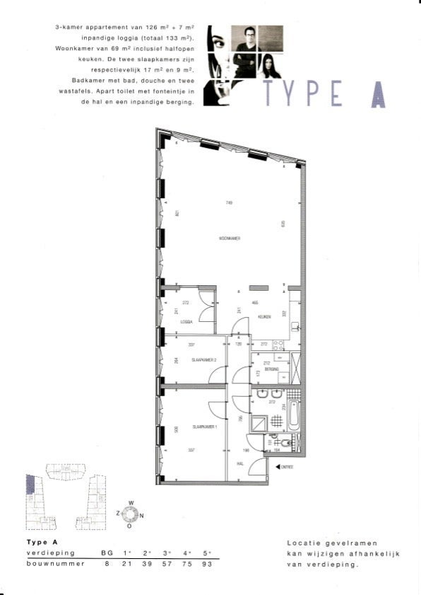 3eVerdieping: ruime hal van 12 m² met toilet en toegang tot alle ruimtes. Royale woonkamer van 69 m² met half open keuken voorzien van spoelbak, 4 pits keramische kookplaat, afzuigkap, combi-oven/magnetron, koelkast en vaatwasser. Inpandige loggia ca.6,5 m². Berging ca 3,5 m² met aansluitingen w. a. en droger. Slaapkamer I ca.17 m², slaapkamer II ca.9 m². Badkamer ca.6 m² met dubbele wastafel, ligbad en douche. Separaat toilet. Kelderberging ca 8 m², aparte fietsenberging en extra brede parking in de onderliggende parkeergarage.