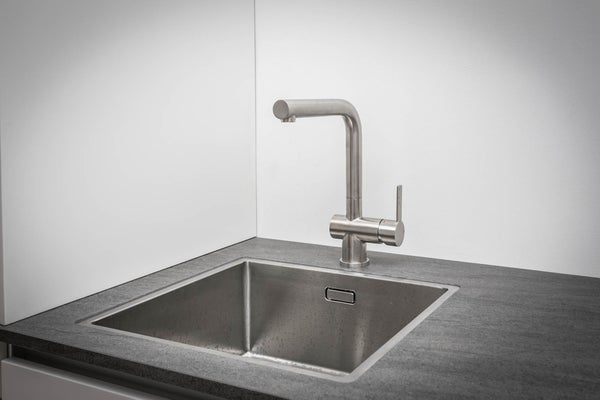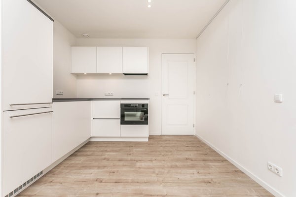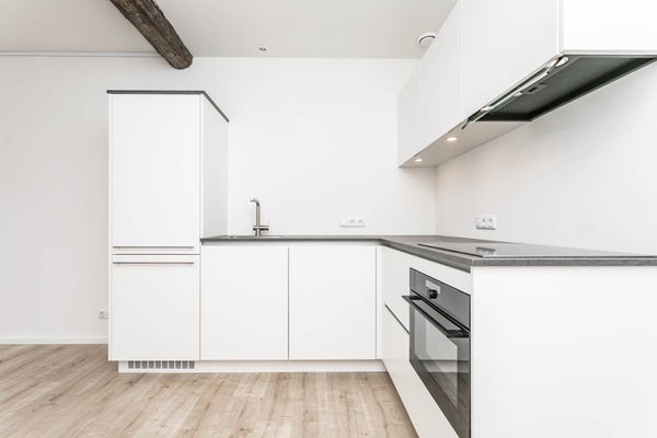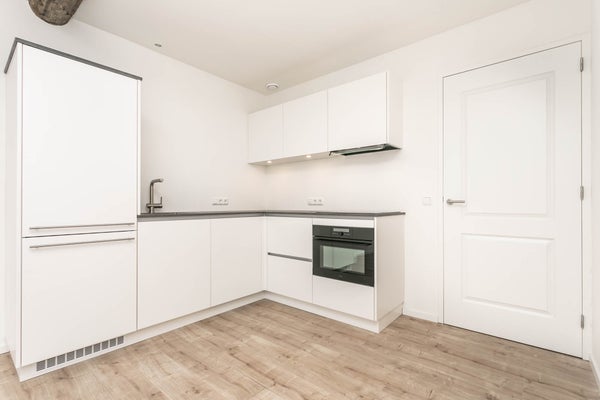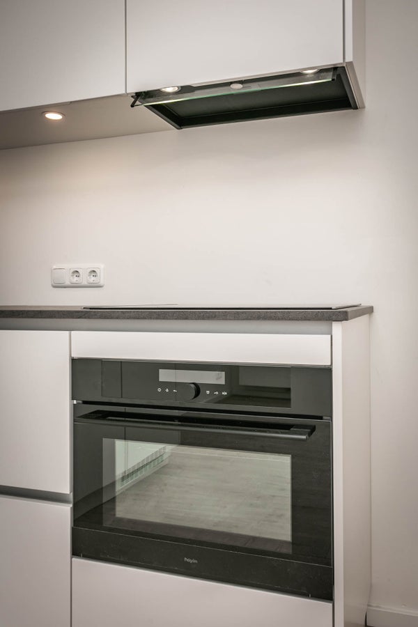 De lichte woonkamer bevindt zich aan de voorzijde van het pand en is voorzien van een stijlvolle L-vormige keukenmet diverse inbouwapparatuur, waaronder een vaatwasser, inductiekookplaat met afzuigkap, koelkast en combi-oven.