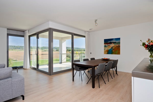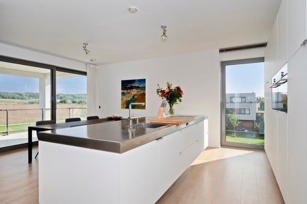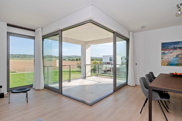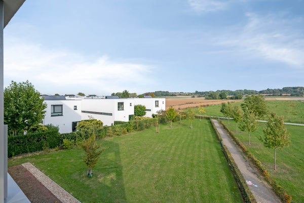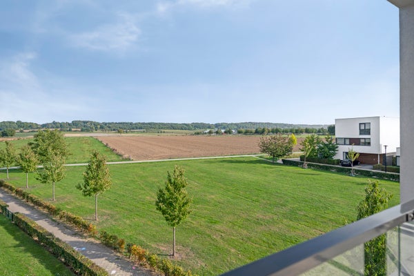 - Zowel vanuit de woonkamer als vanaf het balkon is er prachtig uitzicht over de glooiende akkers en fruitvelden die doorlopen tot aan het Savelsbos;