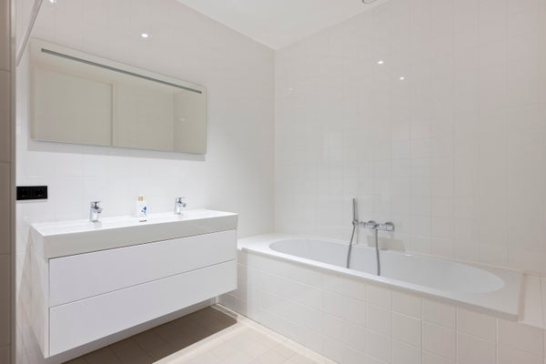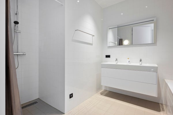 - Volledig betegelde complete badkamer (ca. 7 m²) voorzien van een ligbad, inloopdouche, dubbele wastafel in wastafelmeubel;