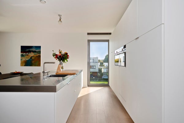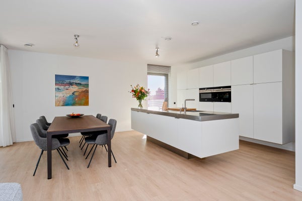 - De open woonkeuken (ca. 18 m²) met moderne keukenopstelling is voorzien van een kookeiland met RVS-werkblad, 4-pits inductieplaat met geïntegreerde afzuiging en wasbak. Verder beschikt de keuken over inbouwapparatuur als een heteluchtoven, magnetron, vaatwasser, en koelkast. De keuken is voorzien van veel kastruimte;