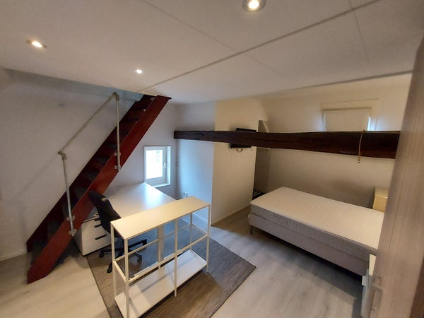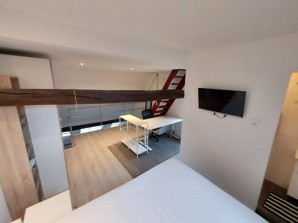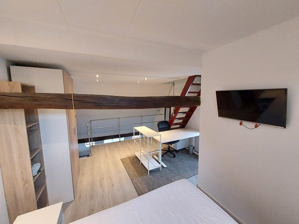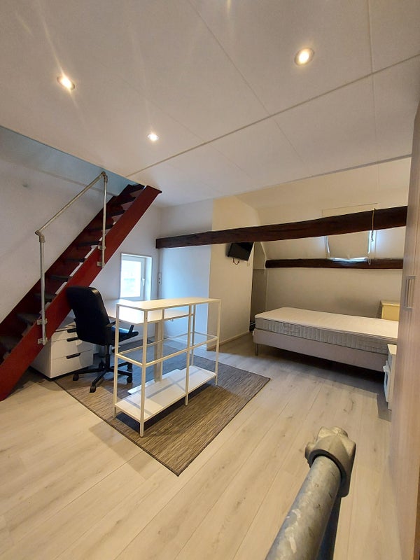 Mooi en charmant ingericht appartement gelegen op de derde verdieping. Het appartement bestaat uit een woonkamer met open keuken, slaapkamer op de mezzanine, badkamer met douche en separaat toilet. Boven de slaapkamer is ook nog een open wasruimte gevestigd, met aansluiting voor wasmachine, waar een extra slaapruimte mogelijk is. De keuken is voorzien van alle gemakken en heeft een rechtstreekse open verbinding met de woonkamer. Het appartement is voorzien van allerlei gemakken en beschikt onder ander over twee tv toestellen en een intercomsysteem. Tevens is er een fietsen/opberggarage aanwezig die u met een electrische deur opent en sluit.